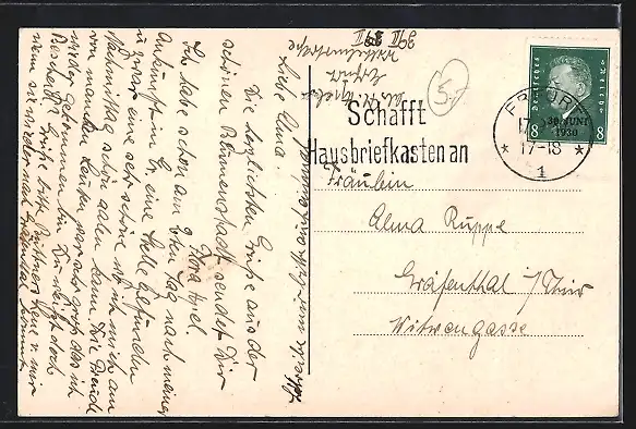 Personenbezogene Daten auf der Rückseite der Karte wurden durch blauen Textmarker unkenntlich gemacht. Die blauen Stellen sind auf die Vorderseite durchgeweicht und wirken sich negativ auf das Postkartenfoto aus