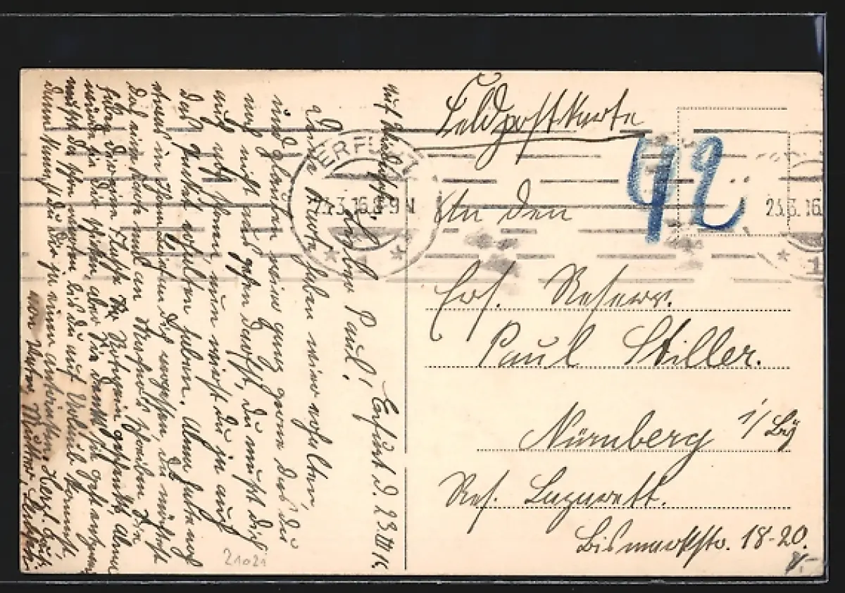 Personenbezogene Daten auf der Rückseite der Karte wurden durch blauen Textmarker unkenntlich gemacht. Die blauen Stellen sind auf die Vorderseite durchgeweicht und wirken sich negativ auf das Postkartenfoto aus