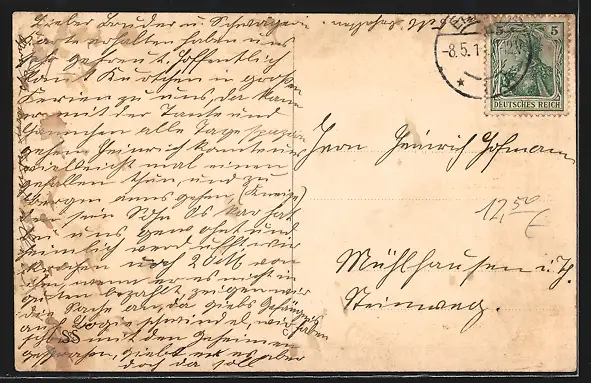 Personenbezogene Daten auf der Rückseite der Karte wurden durch blauen Textmarker unkenntlich gemacht. Die blauen Stellen sind auf die Vorderseite durchgeweicht und wirken sich negativ auf das Postkartenfoto aus