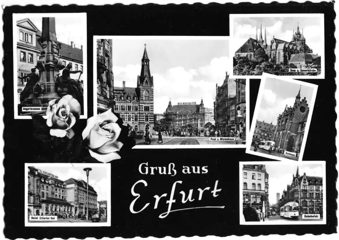 Ansichtskarte Erfurt sechs Abb., gestaltet Angerbrunnen, Post und Warenhaus, Dom und Severikirche, Rathaus, Hotel Erfurter Hof, Bahnhofstr. Erhaltung I-II ungelaufen Druckvermerk: 1961 Herstellungsland: DDR Verlag: KONSUM FOKU Magdeburg - A2347