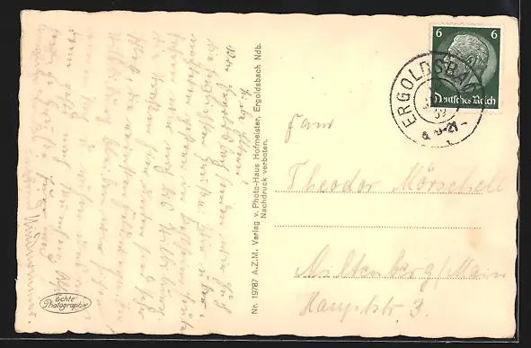 Personenbezogene Daten auf der Rückseite der Karte wurden durch blauen Textmarker unkenntlich gemacht. Die blauen Stellen sind auf die Vorderseite durchgeweicht und wirken sich negativ auf das Postkartenfoto aus