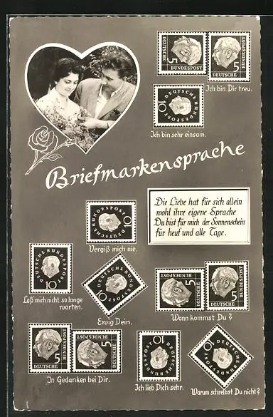 AK Erklärung der Briefmarkensprache, Liebespaar mit Blumen