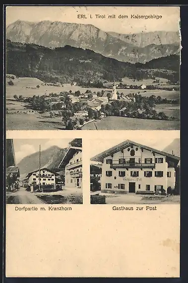 AK Erl, Ortsansicht mit dem Kaisergebirge, Dorfpartie mit Kranzhorn, Gasthaus zur Post