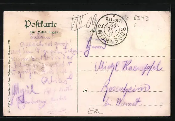 alte Ansichtskarte, gelaufen 1909, Briefmarke entfernt, rückseitig Oberflächenschaden, guter Zustand