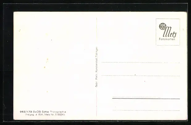 Personenbezogene Daten auf der Rückseite der Karte wurden durch blauen Textmarker unkenntlich gemacht. Die blauen Stellen sind auf die Vorderseite durchgeweicht und wirken sich negativ auf das Postkartenfoto aus