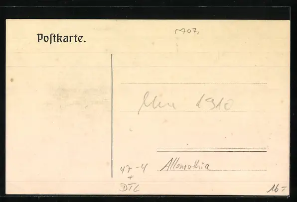 Personenbezogene Daten auf der Rückseite der Karte wurden durch blauen Textmarker unkenntlich gemacht. Die blauen Stellen sind auf die Vorderseite durchgeweicht und wirken sich negativ auf das Postkartenfoto aus