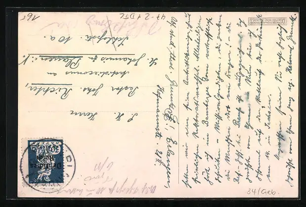 Personenbezogene Daten auf der Rückseite der Karte wurden durch blauen Textmarker unkenntlich gemacht. Die blauen Stellen sind auf die Vorderseite durchgeweicht und wirken sich negativ auf das Postkartenfoto aus