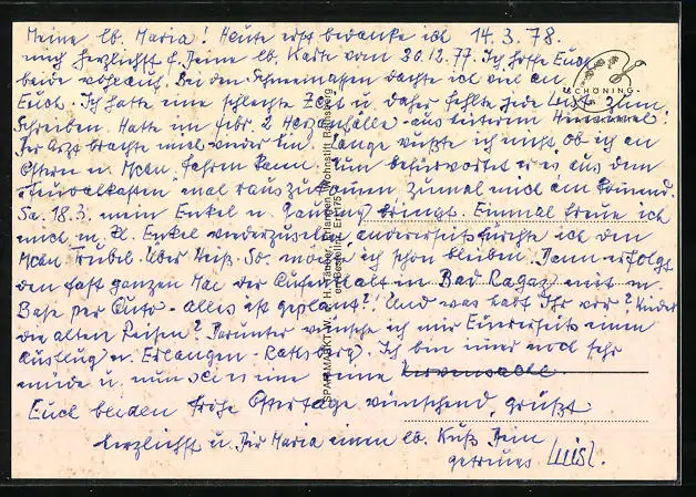 Personenbezogene Daten auf der Rückseite der Karte wurden durch blauen Textmarker unkenntlich gemacht. Die blauen Stellen sind auf die Vorderseite durchgeweicht und wirken sich negativ auf das Postkartenfoto aus