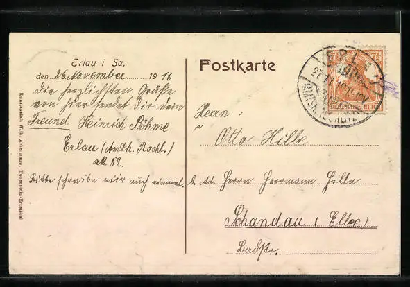 alte Ansichtskarte, gelaufen 1916, Eckknick re. unten, Stempelspur, minimaler Einriss unten mittig, guter Zustand