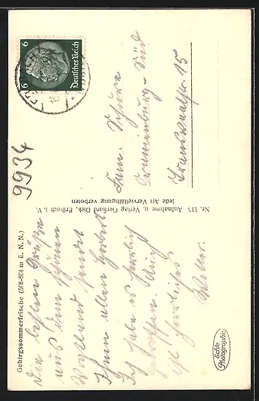 Personenbezogene Daten auf der Rückseite der Karte wurden durch blauen Textmarker unkenntlich gemacht. Die blauen Stellen sind auf die Vorderseite durchgeweicht und wirken sich negativ auf das Postkartenfoto aus