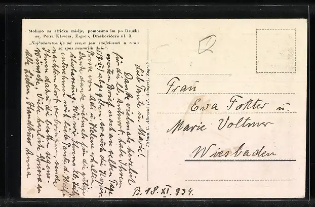 Personenbezogene Daten auf der Rückseite der Karte wurden durch blauen Textmarker unkenntlich gemacht. Die blauen Stellen sind auf die Vorderseite durchgeweicht und wirken sich negativ auf das Postkartenfoto aus