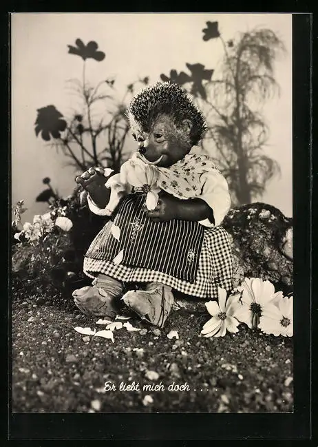 AK Erliebt mich doch...., Mecki-Fräulein beim Blütenzupfen