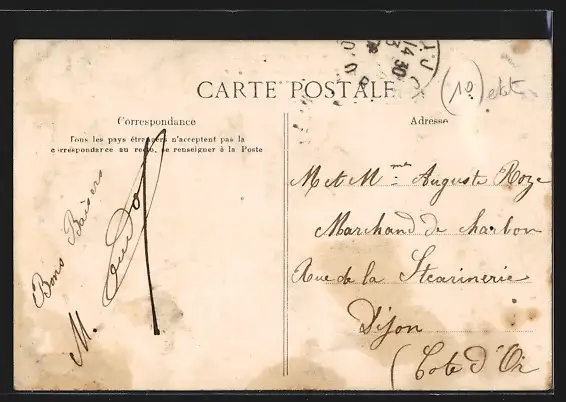 Personenbezogene Daten auf der Rückseite der Karte wurden durch blauen Textmarker unkenntlich gemacht. Die blauen Stellen sind auf die Vorderseite durchgeweicht und wirken sich negativ auf das Postkartenfoto aus