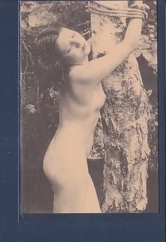 AK Erotik BDSM Frau nackt an einer Birke gefesselt