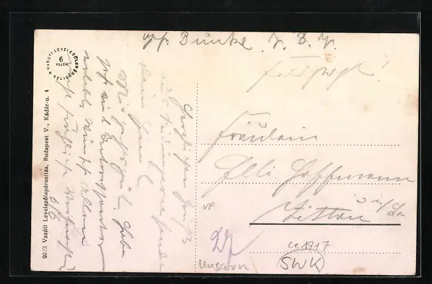 Personenbezogene Daten auf der Rückseite der Karte wurden durch blauen Textmarker unkenntlich gemacht. Die blauen Stellen sind auf die Vorderseite durchgeweicht und wirken sich negativ auf das Postkartenfoto aus