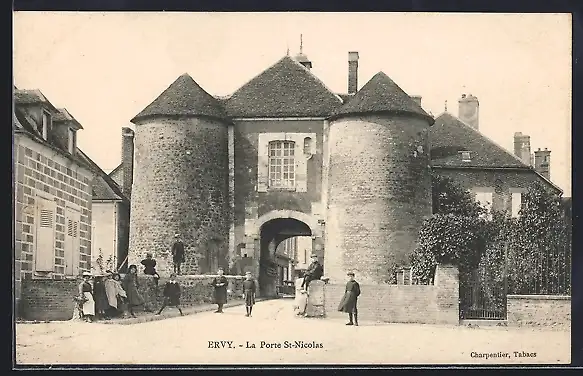 AK Ervy, La Porte St-Nicolas avec des passants devant l`entrée historique