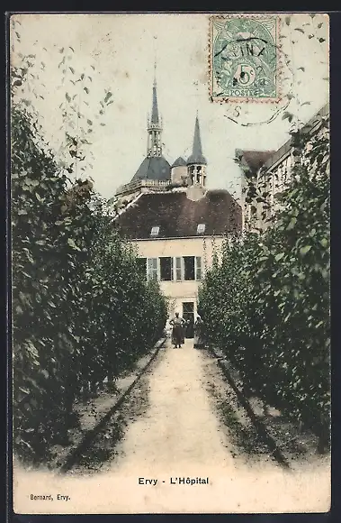 AK Ervy, Vue de l`Hôpital avec flèches de l`église en arrière-plan
