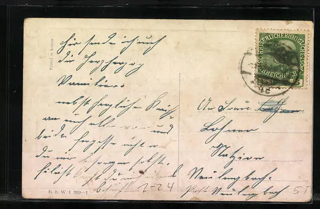 Personenbezogene Daten auf der Rückseite der Karte wurden durch blauen Textmarker unkenntlich gemacht. Die blauen Stellen sind auf die Vorderseite durchgeweicht und wirken sich negativ auf das Postkartenfoto aus