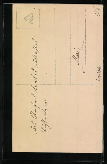 Personenbezogene Daten auf der Rückseite der Karte wurden durch blauen Textmarker unkenntlich gemacht. Die blauen Stellen sind auf die Vorderseite durchgeweicht und wirken sich negativ auf das Postkartenfoto aus