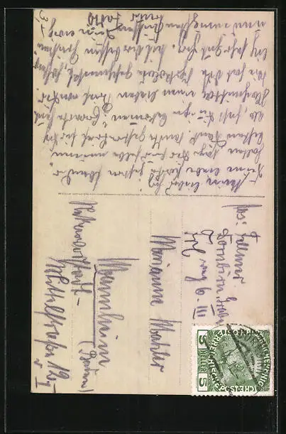 Personenbezogene Daten auf der Rückseite der Karte wurden durch blauen Textmarker unkenntlich gemacht. Die blauen Stellen sind auf die Vorderseite durchgeweicht und wirken sich negativ auf das Postkartenfoto aus
