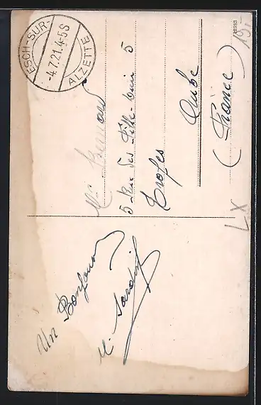 Personenbezogene Daten auf der Rückseite der Karte wurden durch blauen Textmarker unkenntlich gemacht. Die blauen Stellen sind auf die Vorderseite durchgeweicht und wirken sich negativ auf das Postkartenfoto aus