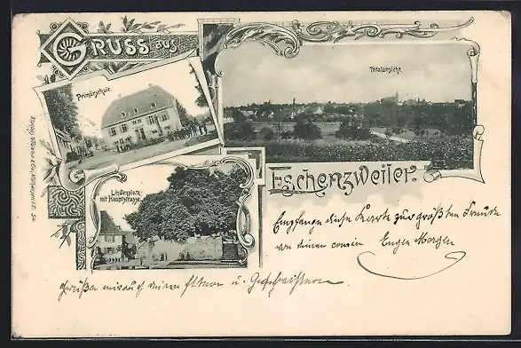 AK Eschenzweiler, Primärschule, Lindenplatz mit Hauptstrasse und Totalansicht