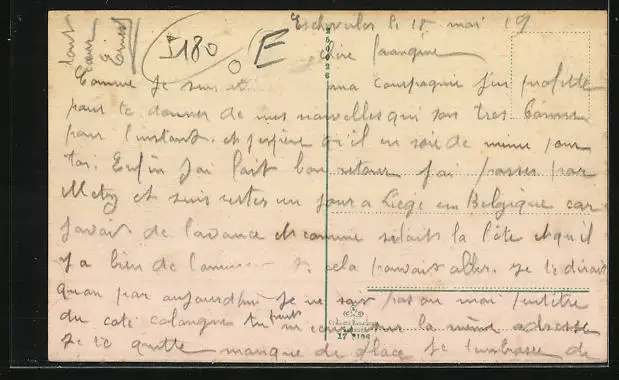 Personenbezogene Daten auf der Rückseite der Karte wurden durch blauen Textmarker unkenntlich gemacht. Die blauen Stellen sind auf die Vorderseite durchgeweicht und wirken sich negativ auf das Postkartenfoto aus