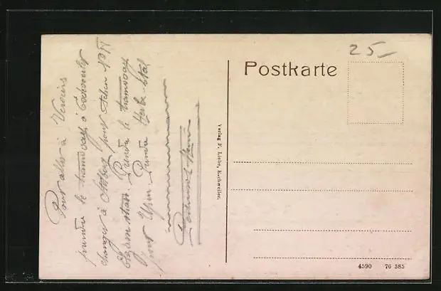 Personenbezogene Daten auf der Rückseite der Karte wurden durch blauen Textmarker unkenntlich gemacht. Die blauen Stellen sind auf die Vorderseite durchgeweicht und wirken sich negativ auf das Postkartenfoto aus