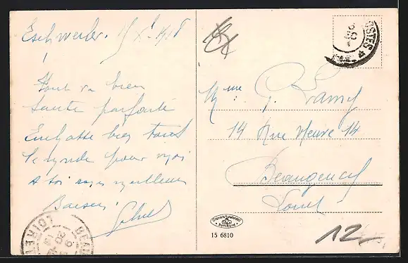 Personenbezogene Daten auf der Rückseite der Karte wurden durch blauen Textmarker unkenntlich gemacht. Die blauen Stellen sind auf die Vorderseite durchgeweicht und wirken sich negativ auf das Postkartenfoto aus