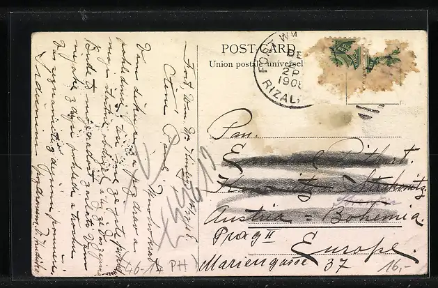 gelaufen 1908, Briefmarke entfernt, rückseitig Oberflächenschaden, Eckknick unten li., guter Zustand