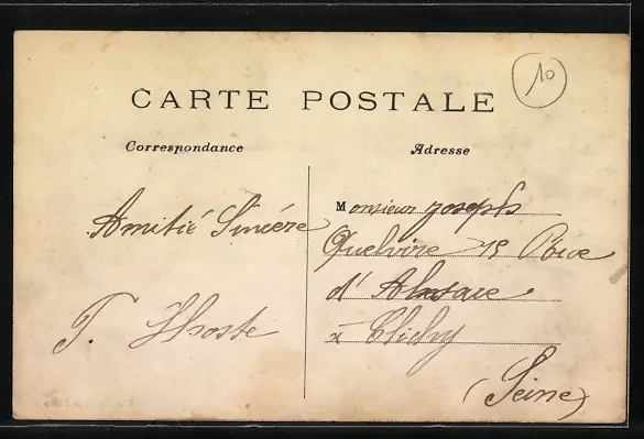 Personenbezogene Daten auf der Rückseite der Karte wurden durch blauen Textmarker unkenntlich gemacht. Die blauen Stellen sind auf die Vorderseite durchgeweicht und wirken sich negativ auf das Postkartenfoto aus