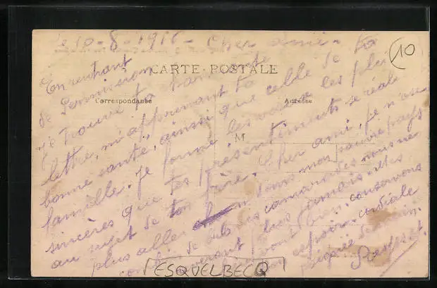 Personenbezogene Daten auf der Rückseite der Karte wurden durch blauen Textmarker unkenntlich gemacht. Die blauen Stellen sind auf die Vorderseite durchgeweicht und wirken sich negativ auf das Postkartenfoto aus