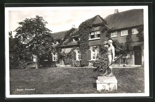AK Essen-Altenhof, Gartenpartie mit Denkmal