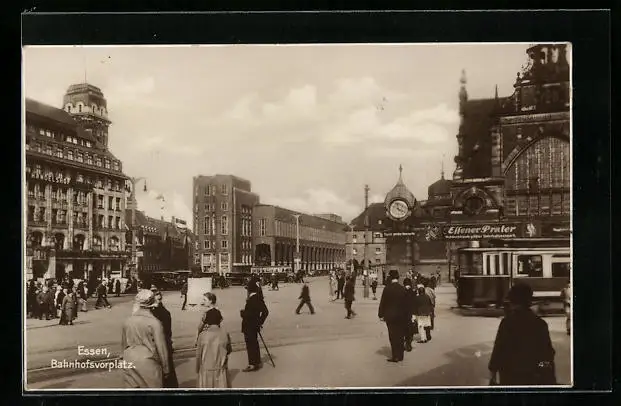 AK Essen, Bahnhofsvorplatz mit Passanten und Strassenbahn