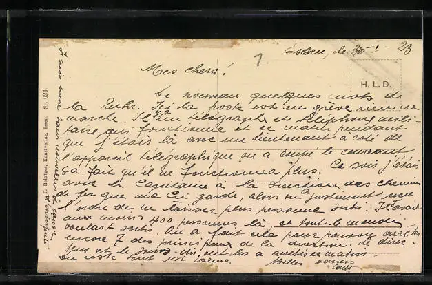 Personenbezogene Daten auf der Rückseite der Karte wurden durch blauen Textmarker unkenntlich gemacht. Die blauen Stellen sind auf die Vorderseite durchgeweicht und wirken sich negativ auf das Postkartenfoto aus