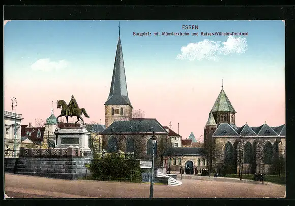 AK Essen, Burgplatz mit Denkmal und Münsterkirche