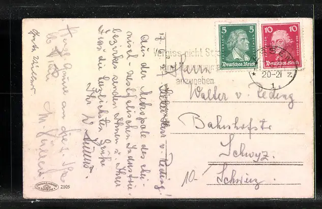 Personenbezogene Daten auf der Rückseite der Karte wurden durch blauen Textmarker unkenntlich gemacht. Die blauen Stellen sind auf die Vorderseite durchgeweicht und wirken sich negativ auf das Postkartenfoto aus