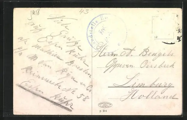 Personenbezogene Daten auf der Rückseite der Karte wurden durch blauen Textmarker unkenntlich gemacht. Die blauen Stellen sind auf die Vorderseite durchgeweicht und wirken sich negativ auf das Postkartenfoto aus