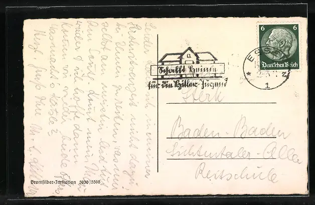 Personenbezogene Daten auf der Rückseite der Karte wurden durch blauen Textmarker unkenntlich gemacht. Die blauen Stellen sind auf die Vorderseite durchgeweicht und wirken sich negativ auf das Postkartenfoto aus