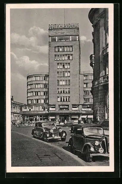 AK Essen, Parkende Oldtimer vor dem Deutschlandhaus