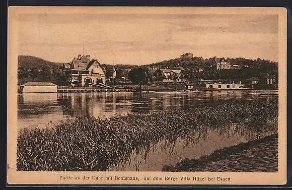 AK Essen, Partie an der Ruhr mit Bootshaus auf dem Berge Villa Hügel