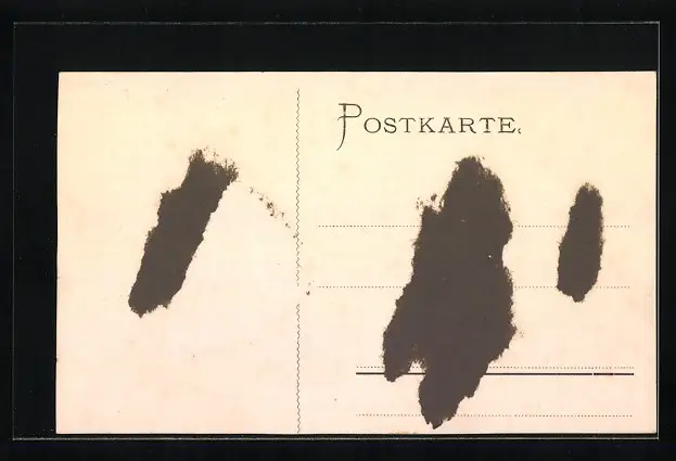 Personenbezogene Daten auf der Rückseite der Karte wurden durch blauen Textmarker unkenntlich gemacht. Die blauen Stellen sind auf die Vorderseite durchgeweicht und wirken sich negativ auf das Postkartenfoto aus