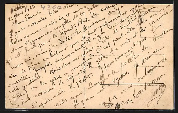 Personenbezogene Daten auf der Rückseite der Karte wurden durch blauen Textmarker unkenntlich gemacht. Die blauen Stellen sind auf die Vorderseite durchgeweicht und wirken sich negativ auf das Postkartenfoto aus