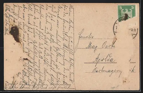 alte Ansichtskarte, gelaufen, Briefmarke entfernt, rückseitig Oberflächenschaden, rückseitig Klebe- und Papierreste, minimaler Einriss re. unten, guter Zustand