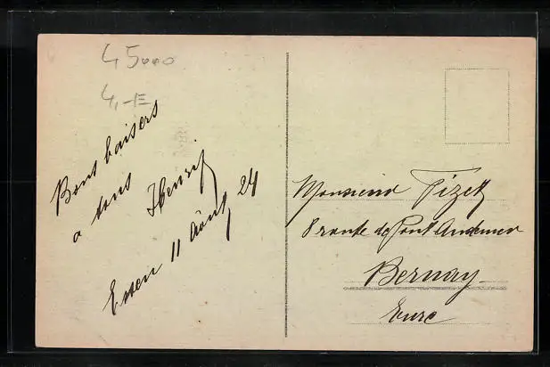 Personenbezogene Daten auf der Rückseite der Karte wurden durch blauen Textmarker unkenntlich gemacht. Die blauen Stellen sind auf die Vorderseite durchgeweicht und wirken sich negativ auf das Postkartenfoto aus