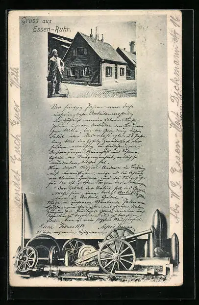 AK Essen /Ruhr, Strassenpartie mit Denkmal, Kanone