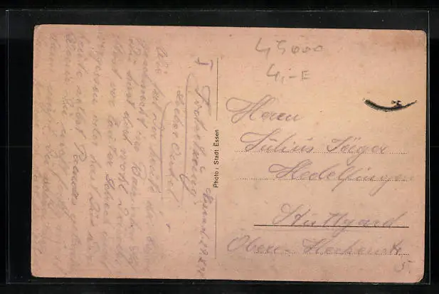 Personenbezogene Daten auf der Rückseite der Karte wurden durch blauen Textmarker unkenntlich gemacht. Die blauen Stellen sind auf die Vorderseite durchgeweicht und wirken sich negativ auf das Postkartenfoto aus