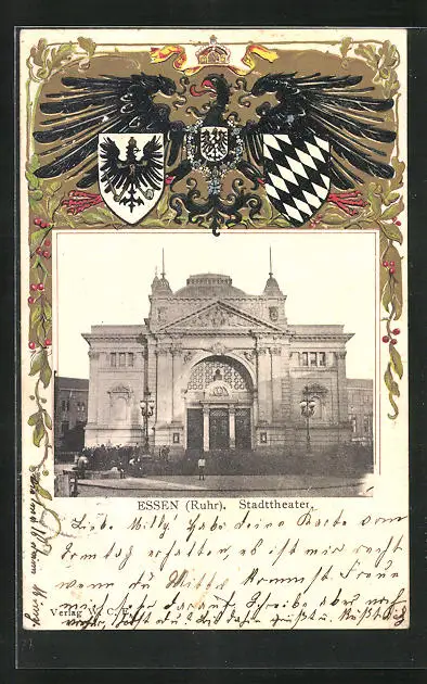 AK Essen / Ruhr, Totalansicht des Stadttheaters, Wappen