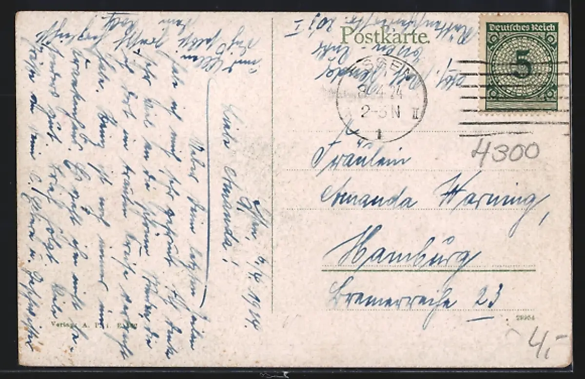 alte Ansichtskarte, gelaufen 1924, Bugspur oben mittig, Eckknick unten rechts, guter Zustand