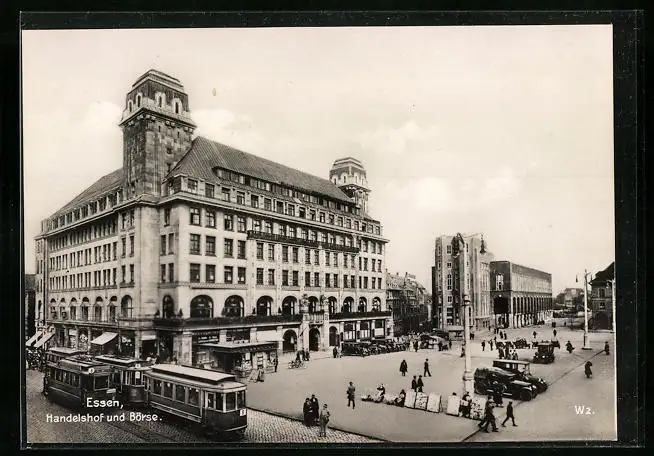 AK Essen, Strassenbahnen passieren Handelshof und Börse
